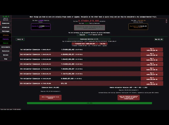 Antimatter Dimensions has earned cult status in the incremental game community for its depth, its humor (loading screen messages are legendary), and its willingness to push the boundaries of what an idle game can be. Multiple years of development have produced a game with more content than most AAA releases, all hidden behind what initially appears to be a simple number generator.